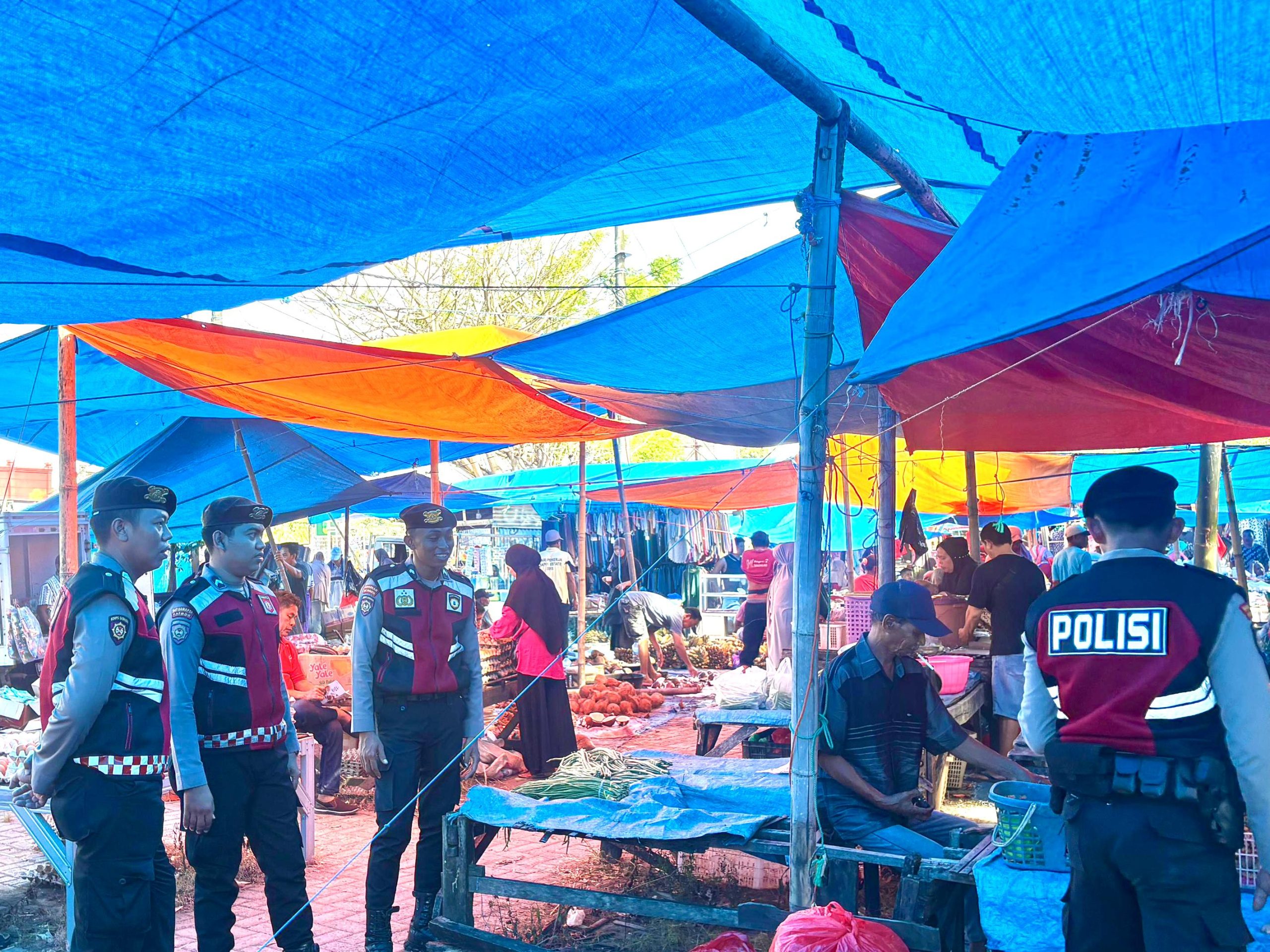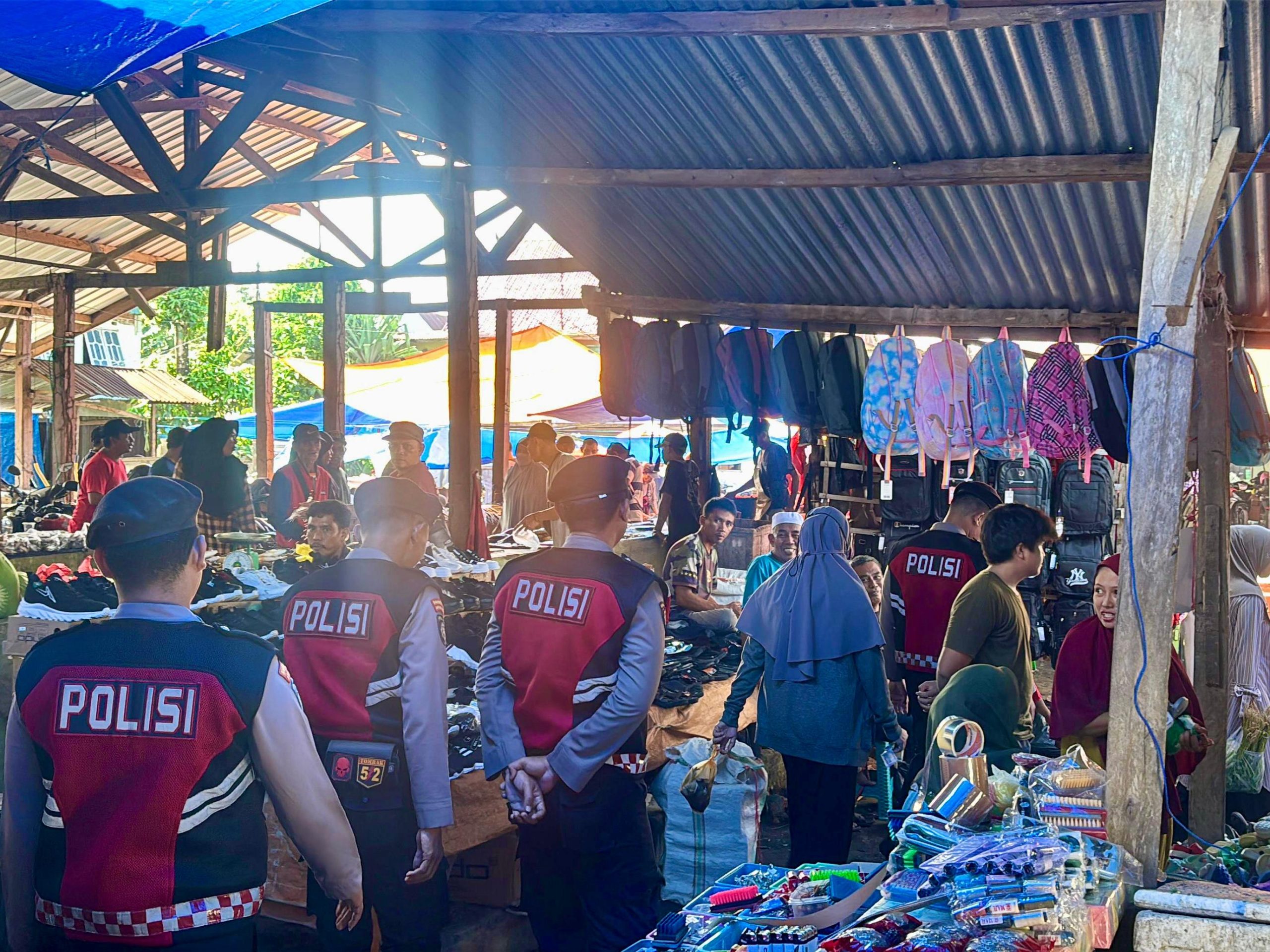 Mereka menyampaikan imbauan kamtibmas agar masyarakat tetap waspada terhadap berbagai bentuk kejahatan, seperti penipuan, pencurian, dan peredaran uang palsu, yang kerap terjadi di area pasar tradisional.